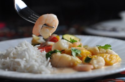 Curry de fruits de mer et citrouille rôtie au four